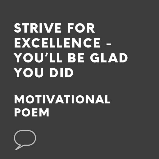 Order our Ready-to-Go Motivational poem on the topic ofStrive for excellence – you’ll be glad you didThis short poem suggests that you should try to excel in your life. It motivates you to choose a different attitude and not to accept second best. It may be used on its own or as an unusual ending to our relevant speech.